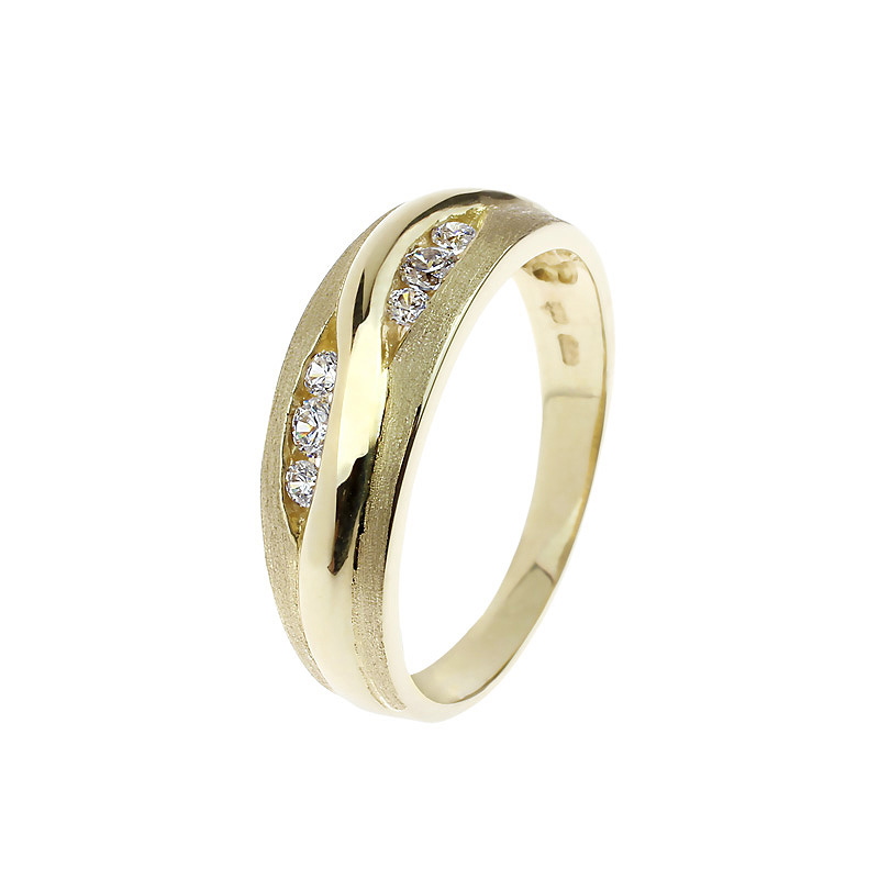A sárga arany és a cirkónia kövek kombinációja elegáns fényt kölcsönöz ennek a letisztult gyűrűnek. A fényes-matt felület játékossága még különlegesebbé teszi, így tökéletes kiegészítője lehet bármilyen stílusnak.